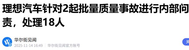 点击上方↑“电动智家”关注,记得加☆“星”!电动智家讯,11月14日,据多家媒体报道,理想汽车对两批次质量事故承担内部责任,处理18人。涉及2024款巨型车冷却液泄漏事故和2025款L系列车下摆臂衬套异响事故。泄漏事故处理,主要责任:研发运营-材料技术部。五名员工(如李)将因冷却液验证不足而被追究责任。对直接责任人员解除合同,经理取消晋升资格,扣除年终奖金。 次要责任:研发质量、质量安全部门5名员工(周某等)因风险评估不当进行讨论,步骤同上。在处理下摆臂衬套异响事故中,4名员工智能底盘部门(如CUI)因测试中润滑脂验证不足而被追究责任。直接责任人员被解除合同,经理不得晋升,年底扣除奖金。罢工措施,直接责任人:解除劳动合同。管理层:如果年度绩效不高于我,将取消资格奖金和晋升资格。 2025年10月23日,一辆2024款完美兆丰(参数|图片)在上海行驶时起火。该公司内部调查和云端数据分析显示,两批次车辆均因事故车辆冷却液防腐性能不够,导致电瓶前电机控制器冷却铝板在一定条件下发生腐蚀泄漏,导致故障灯亮起,限制了车辆的正常行驶。wer,并使其无法开机。极端情况下,动力电池存在热失控风险。 10月31日下午,国家市场监督管理总局发布公告称,北京理想汽车股份有限公司将召回部分兆丰2024款完美电动汽车。部分2025款L系车辆(智能刷新版)出现批量投诉,前轮/前悬架噪音异常。经调查,问题是由于下摆臂衬套所使用的工况润滑脂在高温下的粘度变化而引起的偶尔出现的噪音。这是一起因核查不充分而引发的批次质量事故;该问题的技术修正已于7月底完成。经官方认定,对车辆性能、行驶安全性、耐久性无影响。